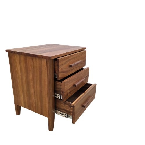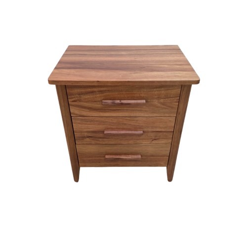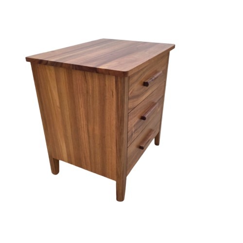 Three drawer bedside featuring handcrafted timber handles with dovetail joints. A timeless design.