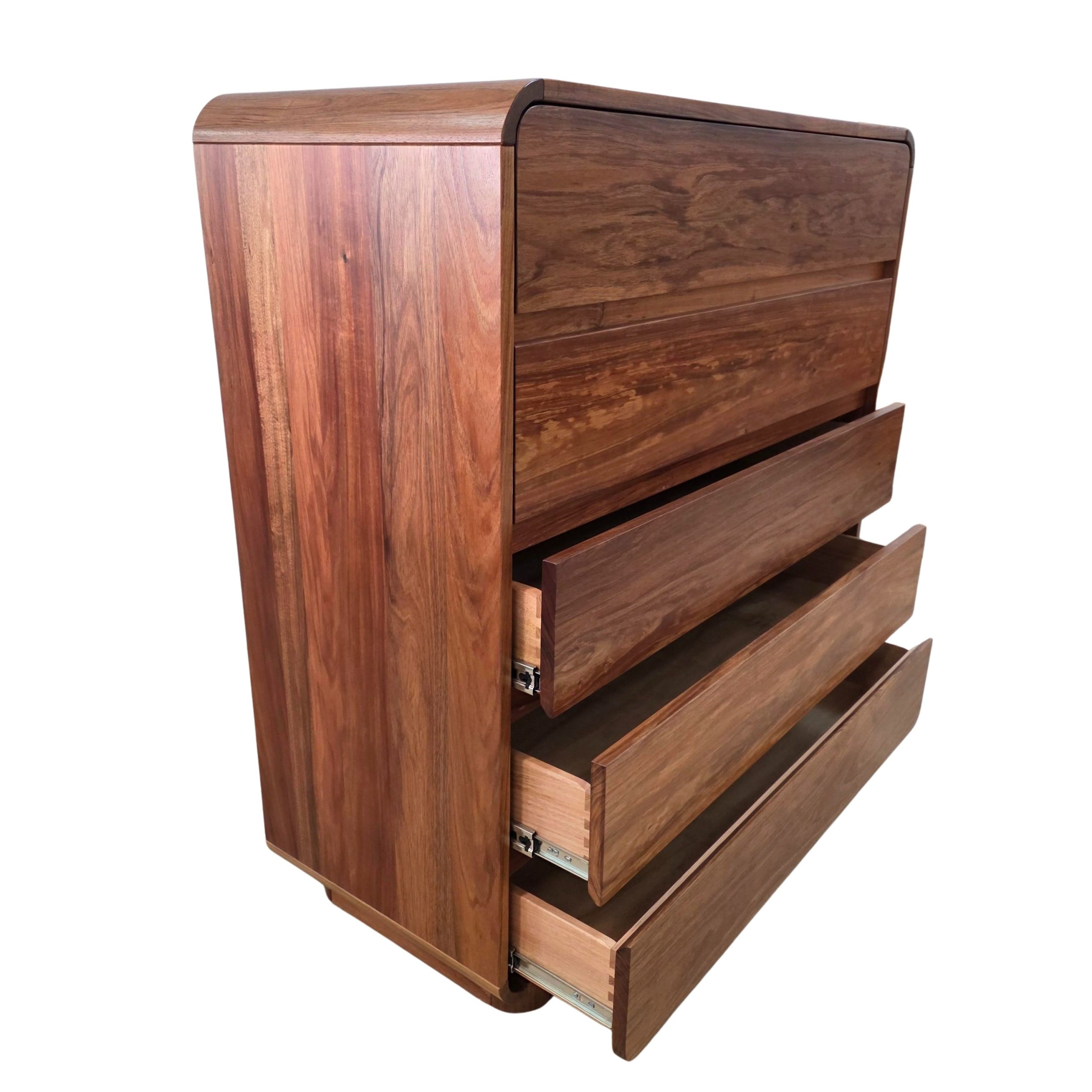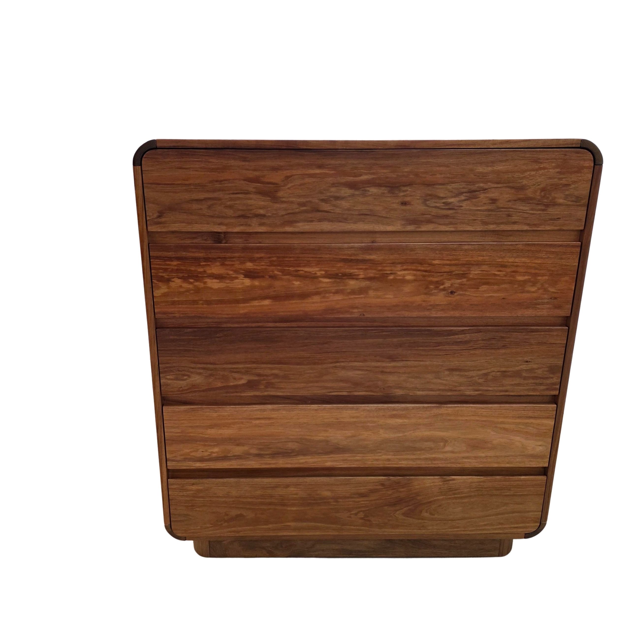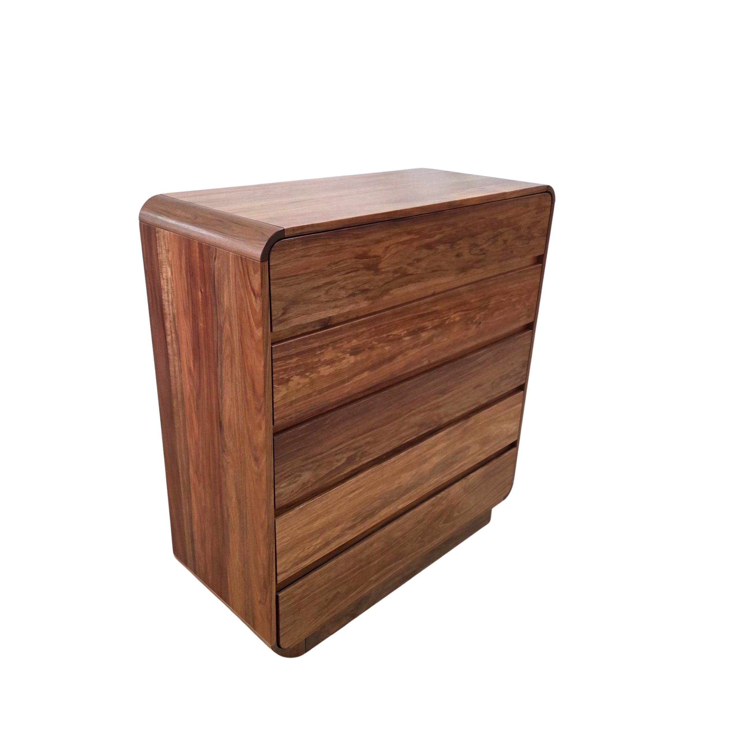 Generous drawers for all your winter woollens with a lovely soft, curved style, the Gordon tallboy features 5 dovetailed finger pull drawers. Available in custom sizes and timbers.